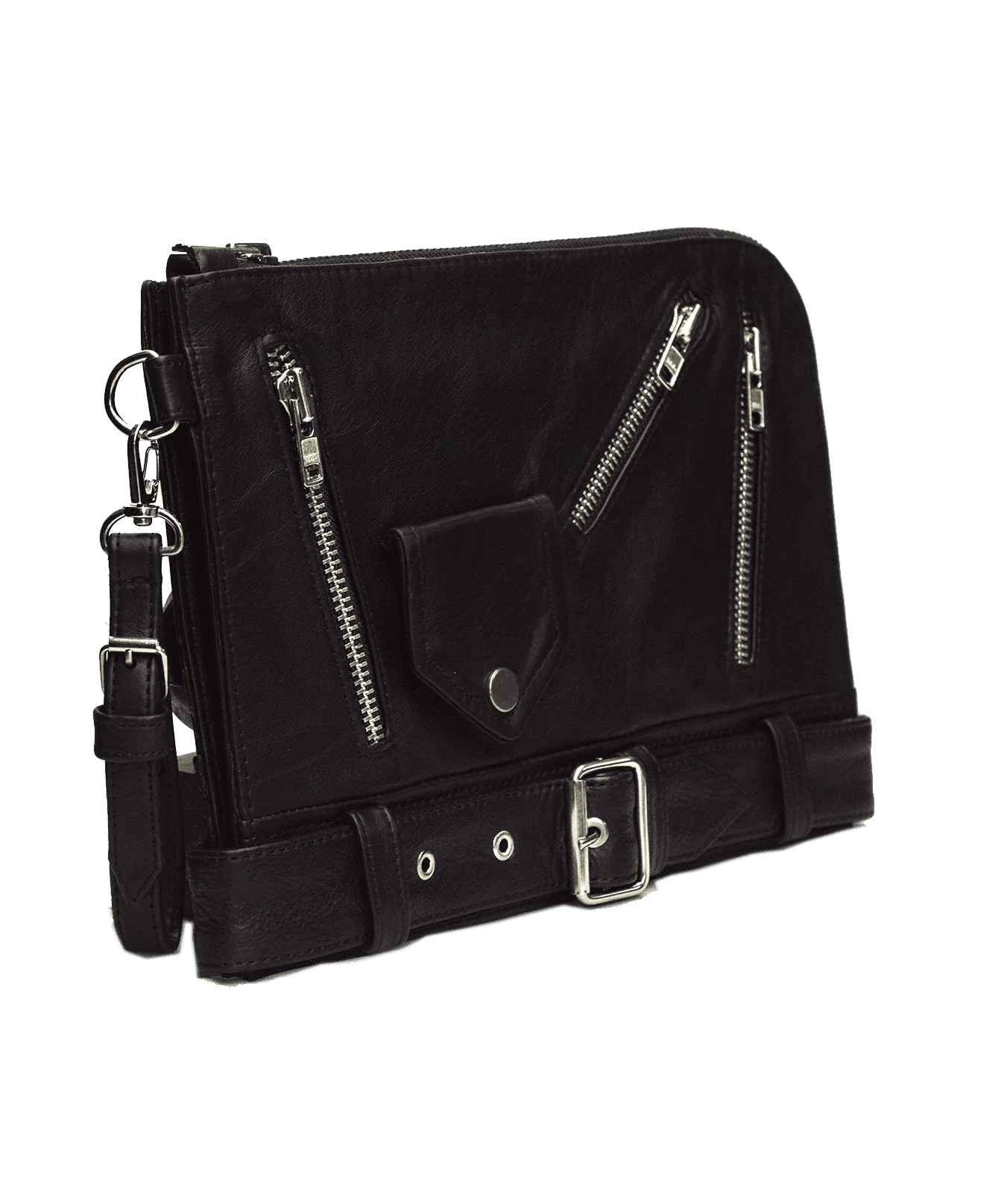 Su correa larga, fina, regulable y desmontable de cuero vacuno con ojales permite llevar la cartera en la cintura en su forma clásica o cruzada en los hombros.